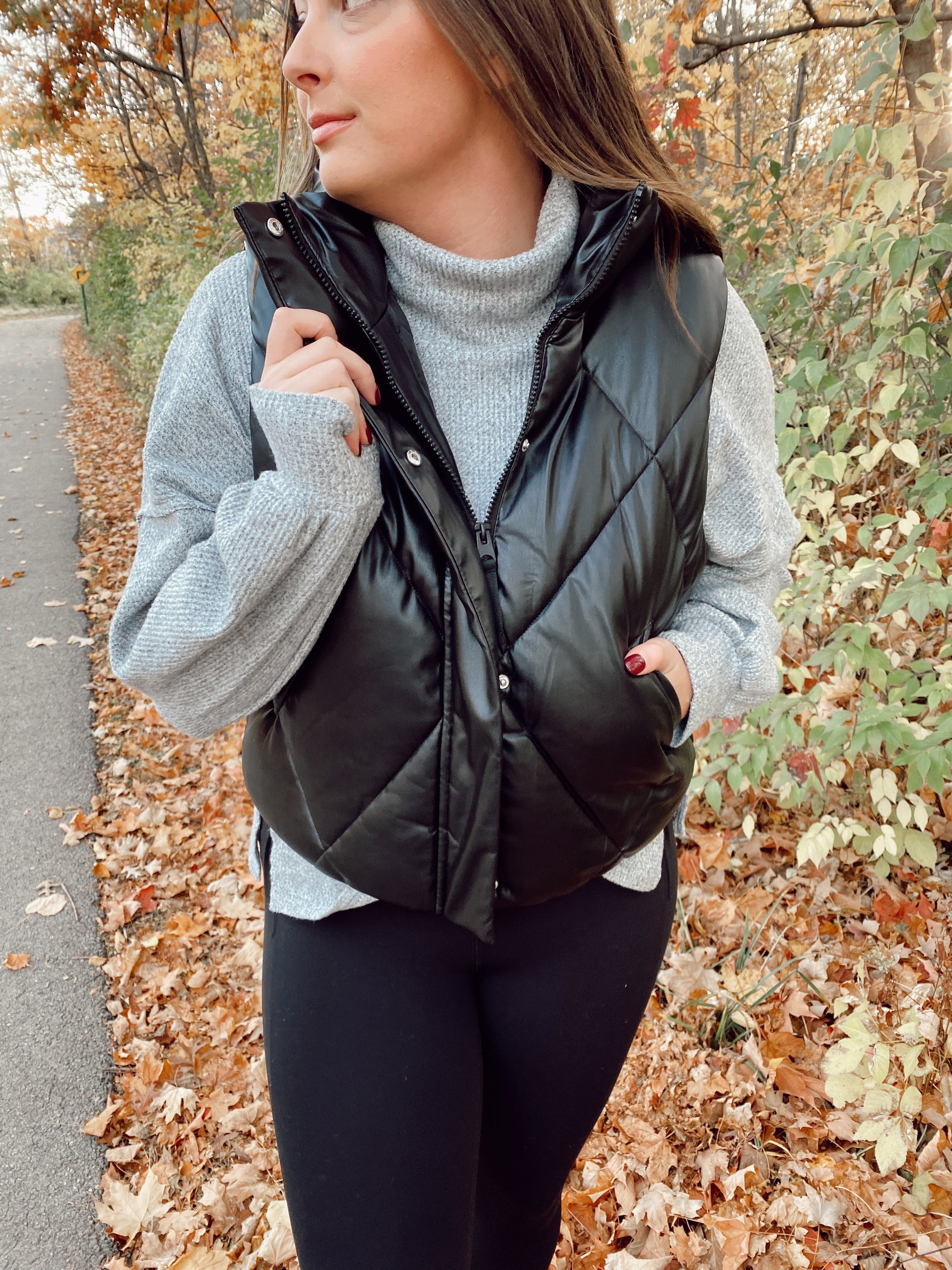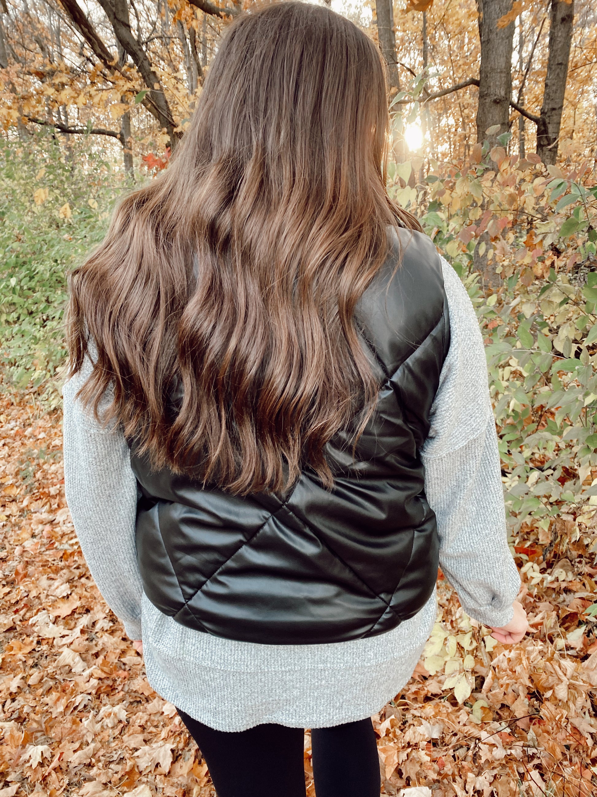 Stay warm and stylish with our black puffer vest. This vest features a large diamond stitch pattern that adds a touch of sophistication to your outfit. Perfect for layering, this vest is a great addition to your fall and winter wardrobe. The puffer design ensures you'll stay warm and cozy on even the coldest days. Whether you're running errands or heading out for a hike, this versatile vest will keep you comfortable and stylish. Don't let the cold weather stop you from looking your best - order your black puffer vest today!