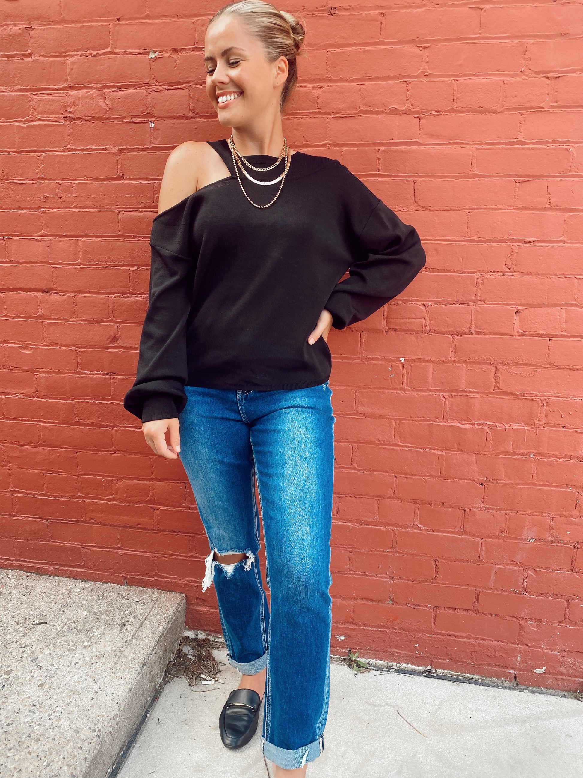 Long sleeve sweater featuring a cold shoulder design with a round neck.