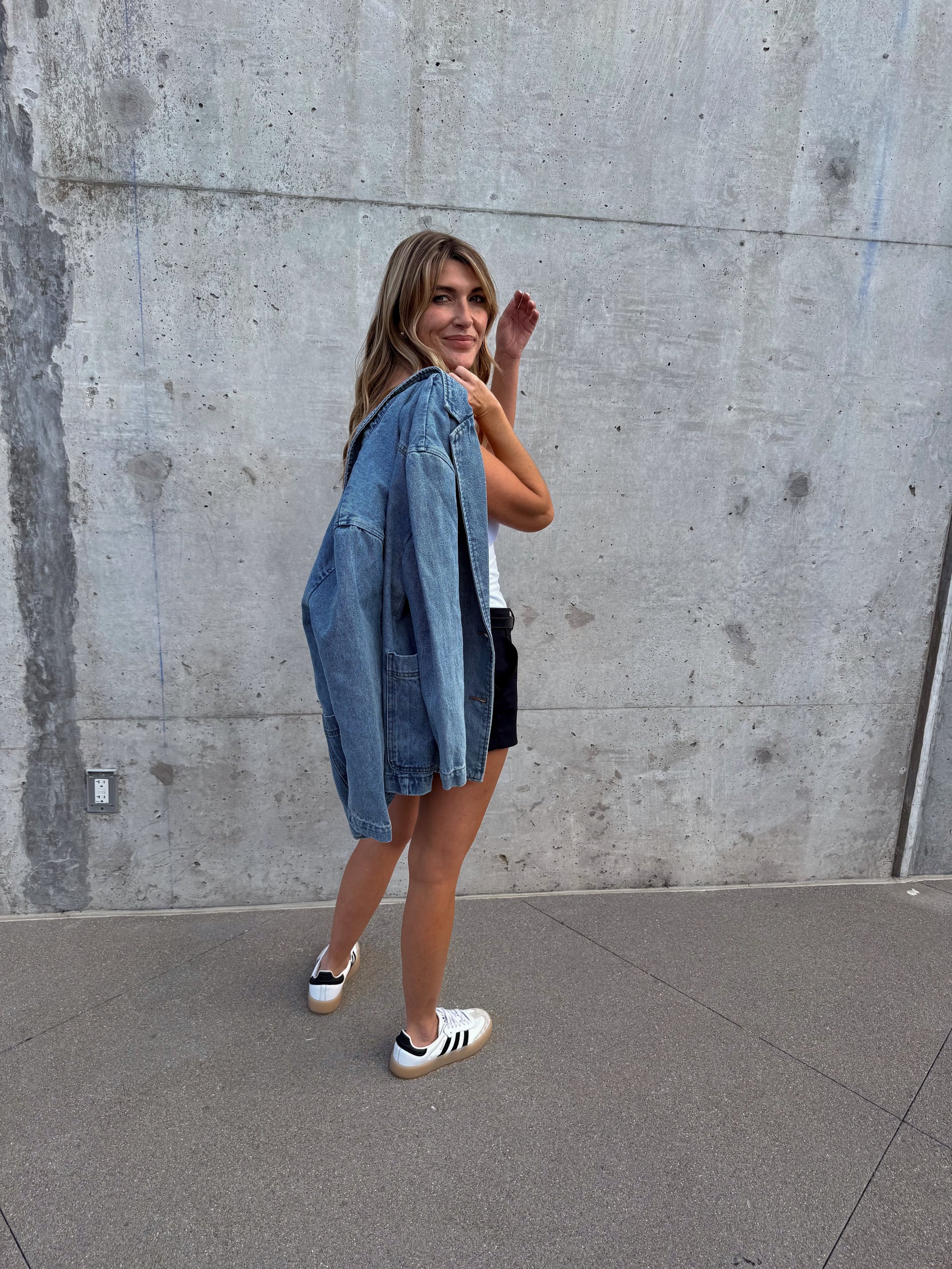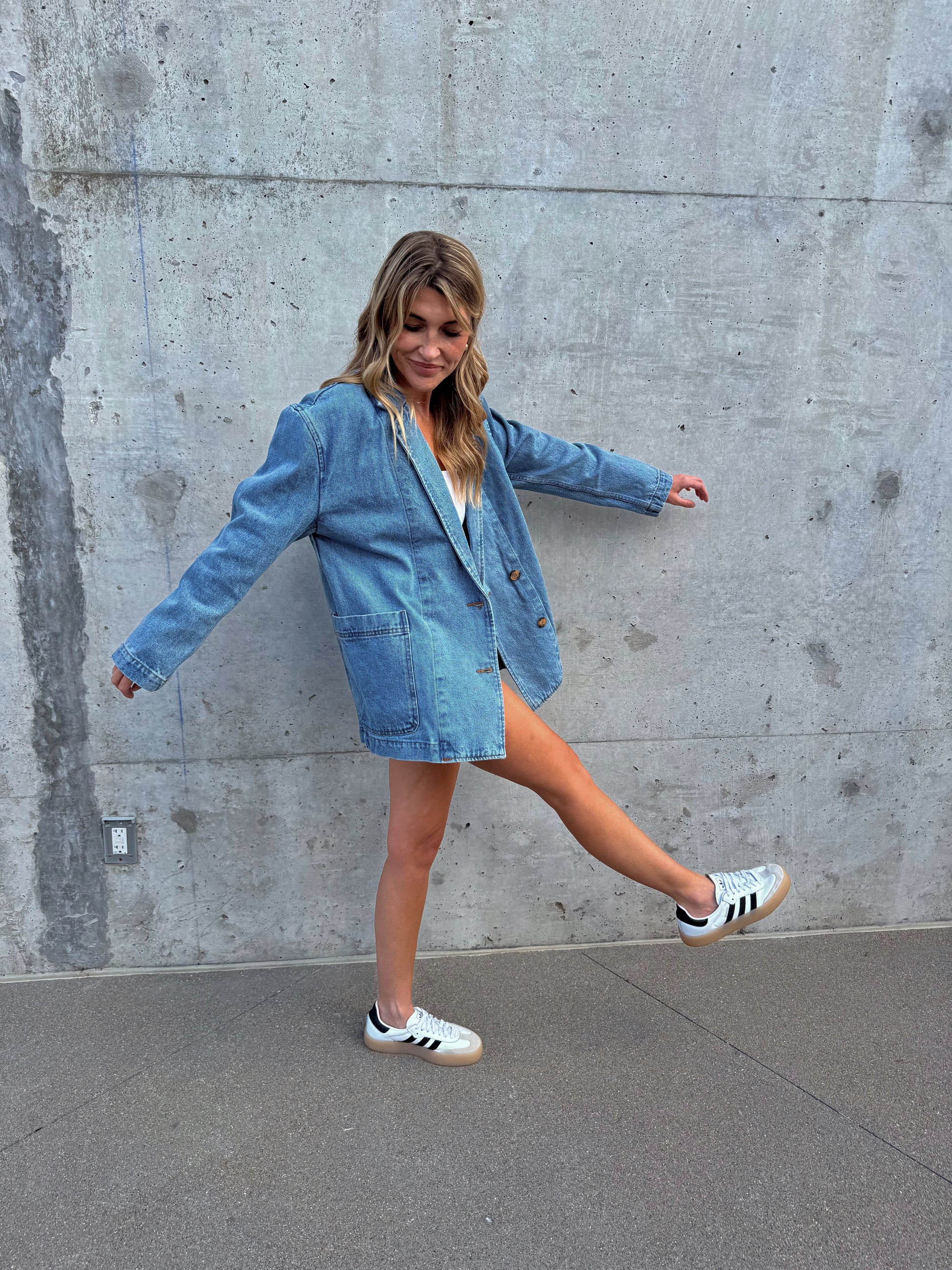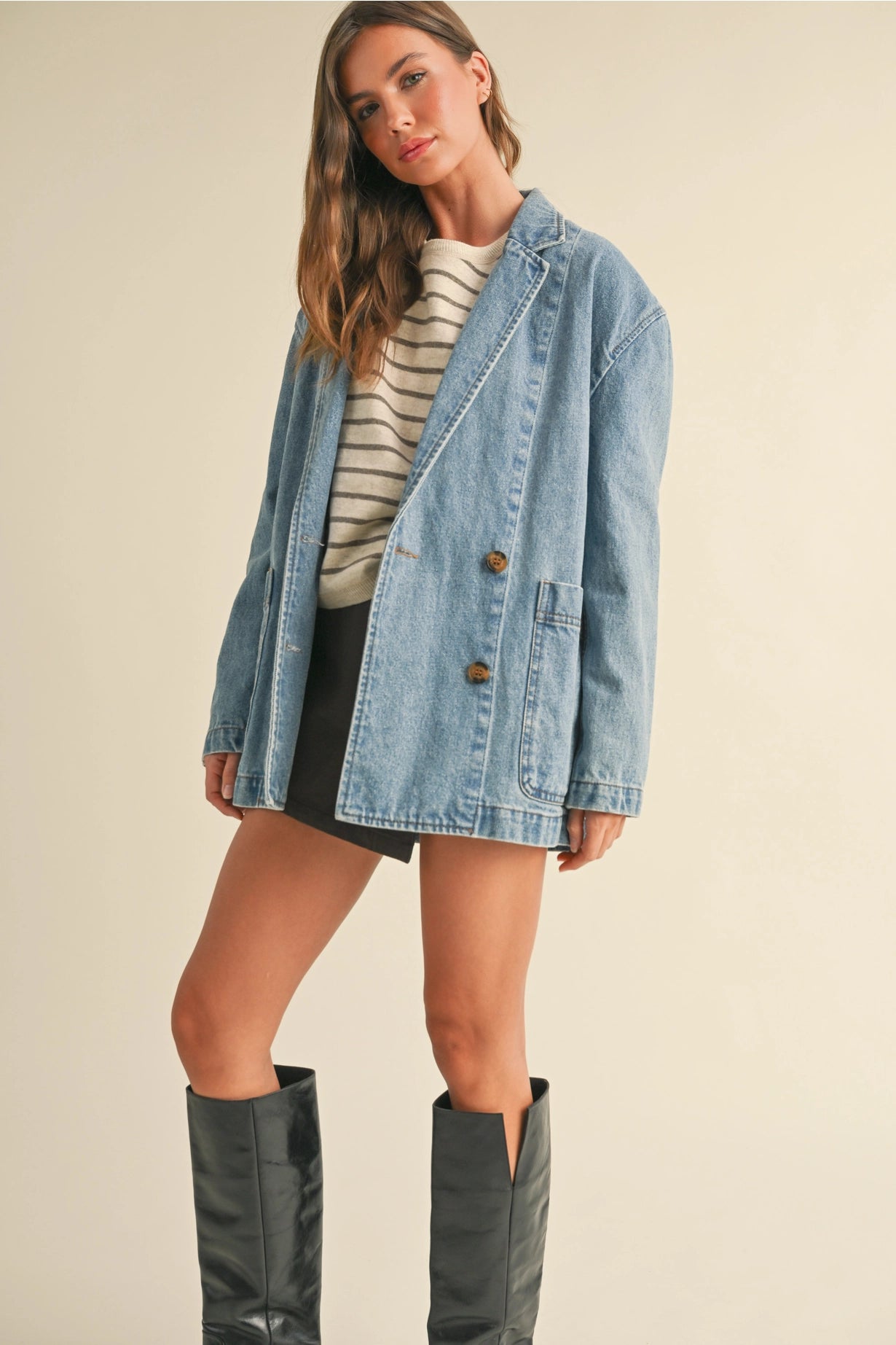 Elevate your wardrobe with our versatile Denim Blazer, a modern take on the classic Denim Jacket silhouette. This premium denim blazer combines tailored sophistication with casual comfort, making it the perfect layering piece. Whether styled over a t-shirt or dressed up with business casual attire, this denim blazer delivers both style and versatility. The oversized cut offers a contemporary update to the traditional denim jacket design, while maintaining the durability and timeless appeal that makes denim outerwear essential for any wardrobe