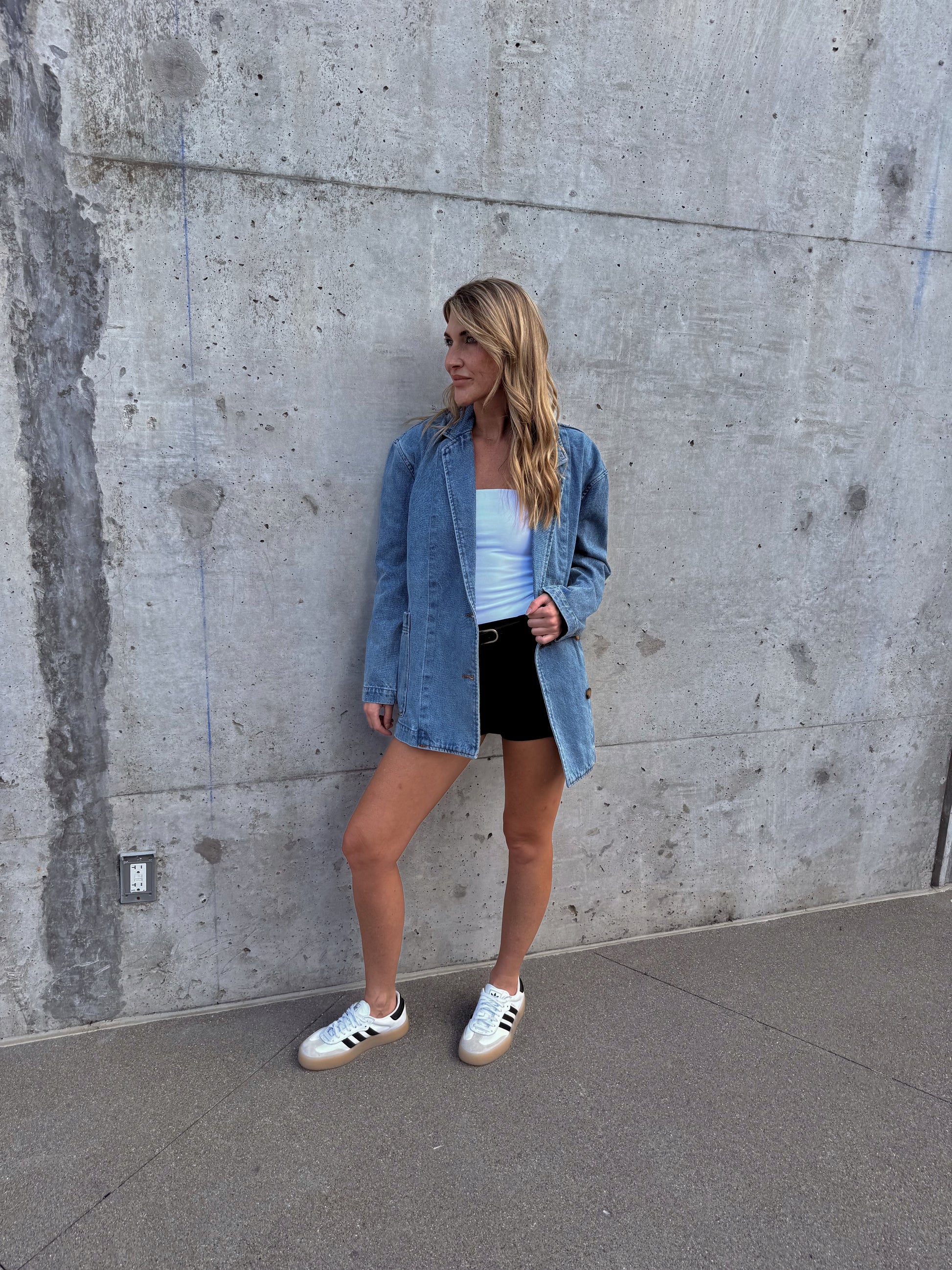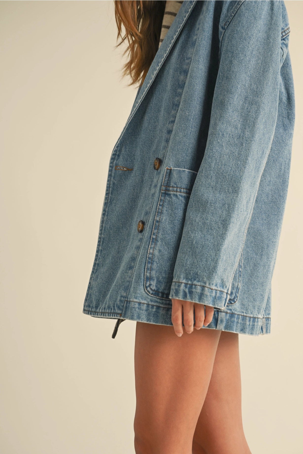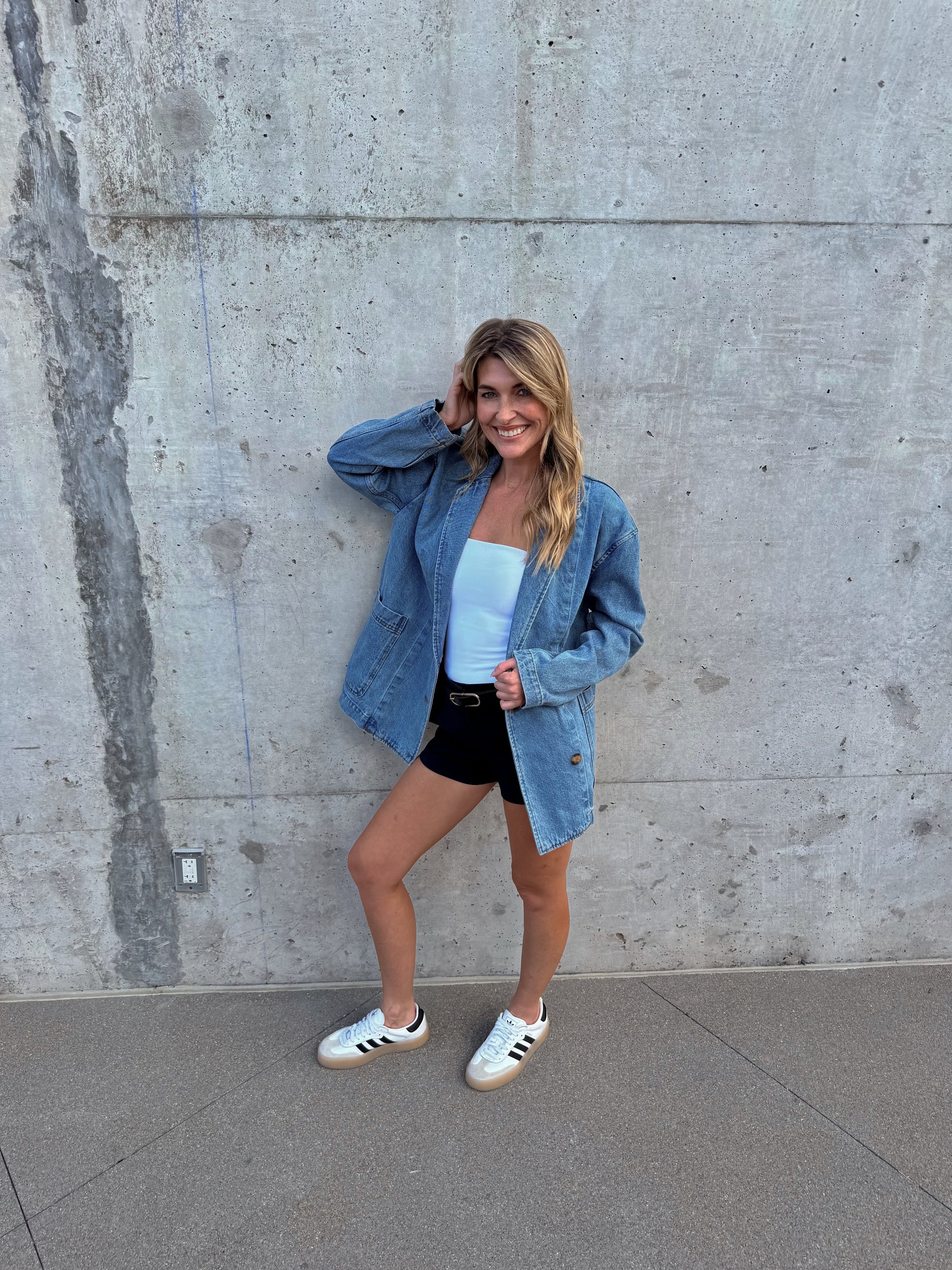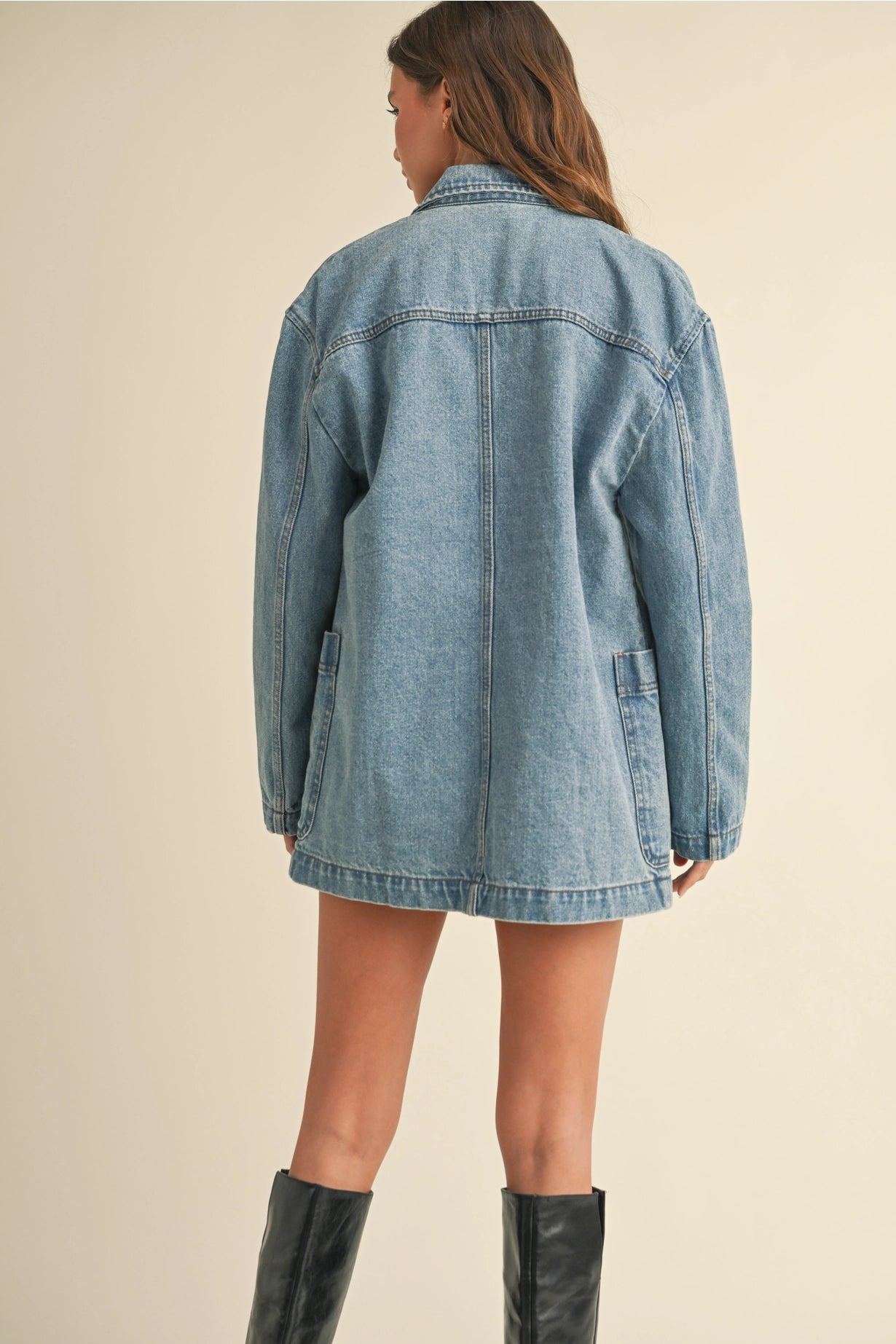 Elevate your wardrobe with our versatile Denim Blazer, a modern take on the classic Denim Jacket silhouette. This premium denim blazer combines tailored sophistication with casual comfort, making it the perfect layering piece. Whether styled over a t-shirt or dressed up with business casual attire, this denim blazer delivers both style and versatility. The oversized cut offers a contemporary update to the traditional denim jacket design, while maintaining the durability and timeless appeal that makes denim outerwear essential for any wardrobe