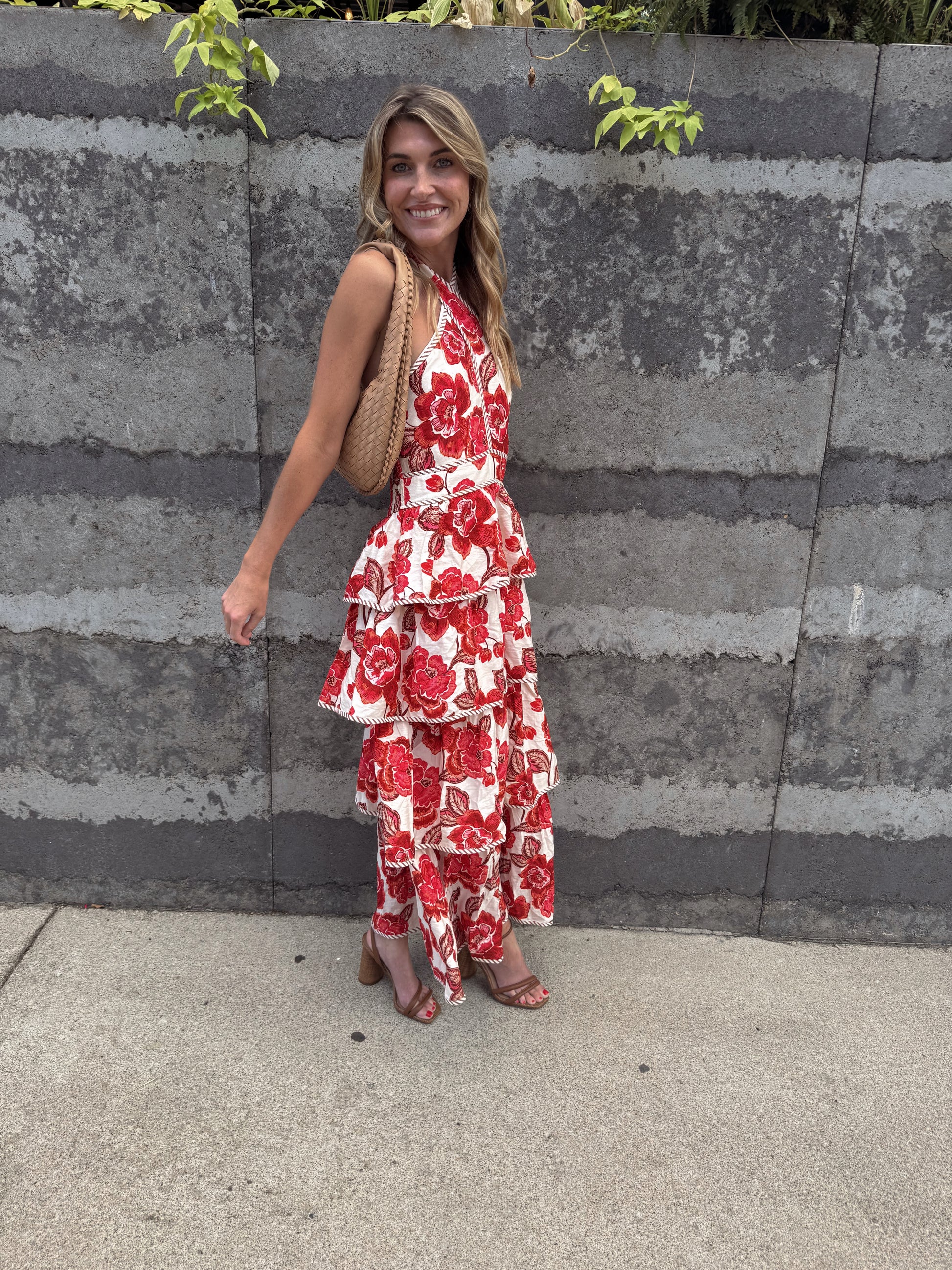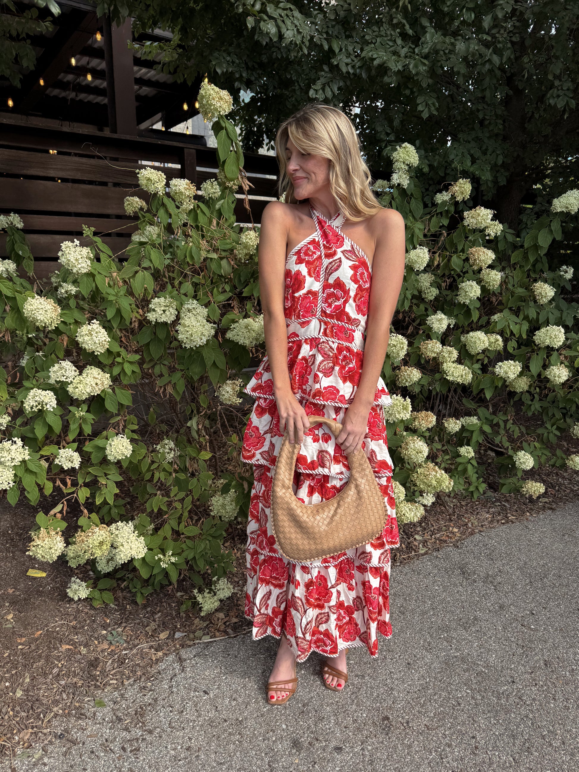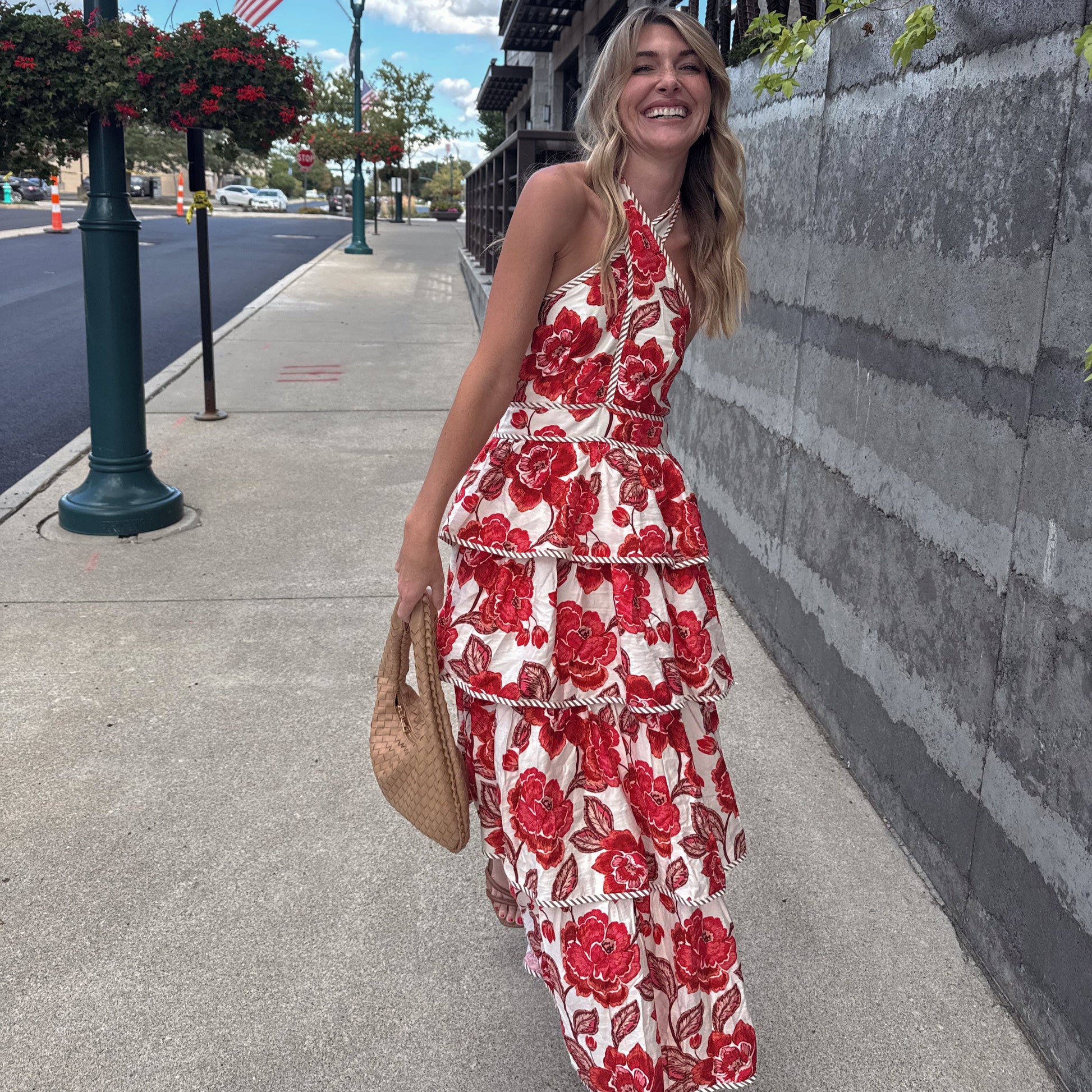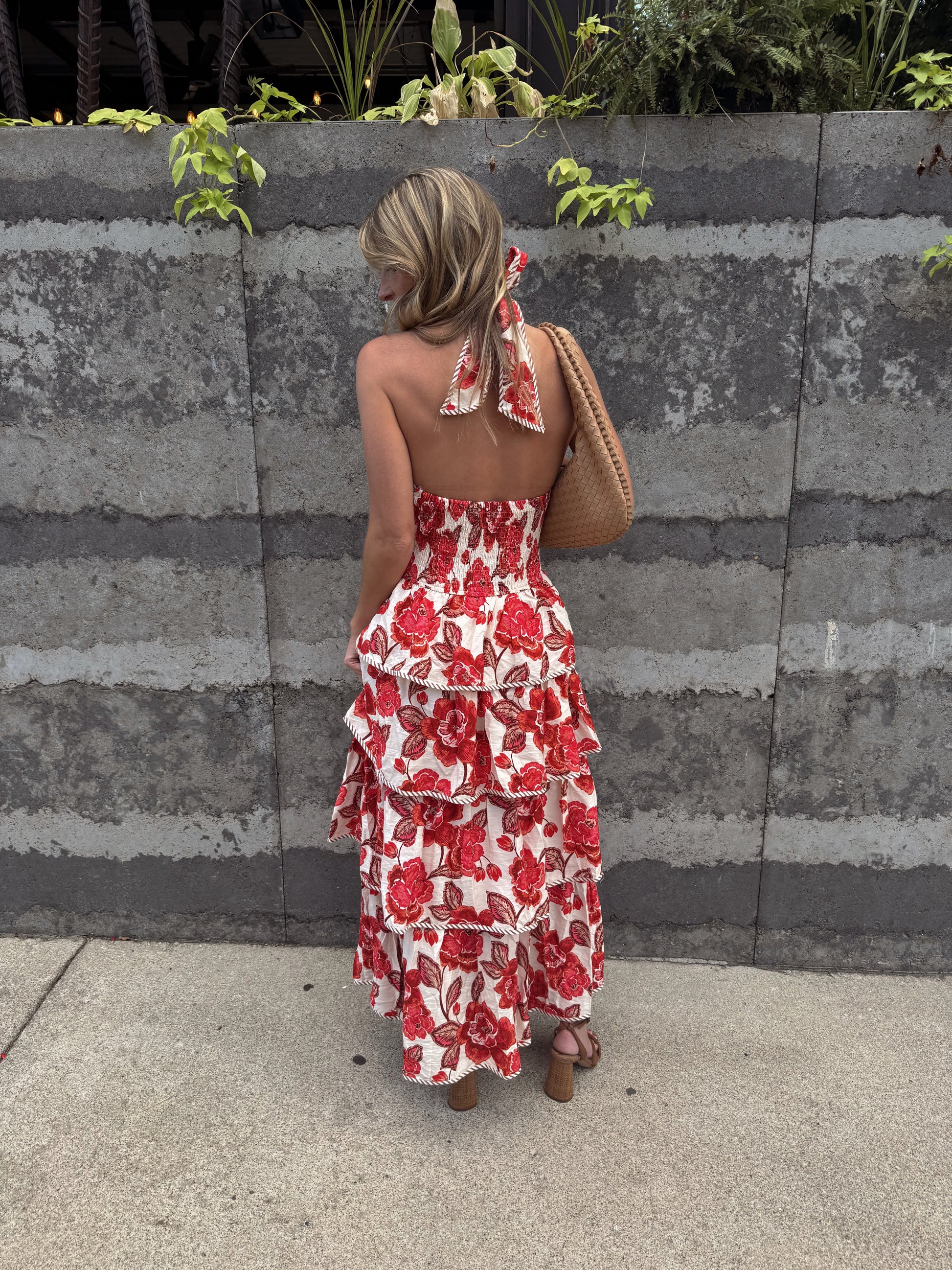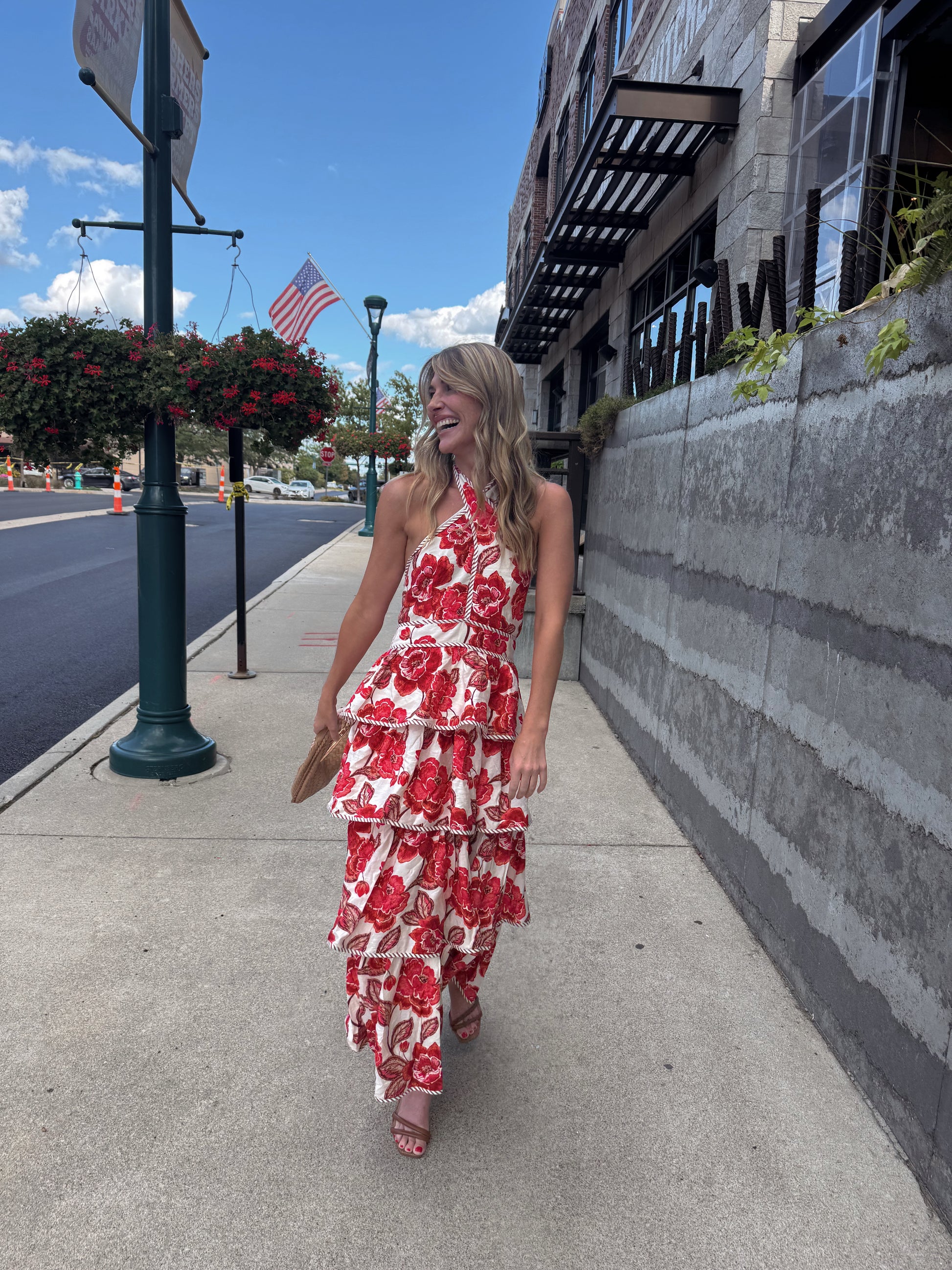 This floral print tiered midi dress combines feminine charm with comfortable design. Featuring a bow tie halter neckline and contrast-accented binding for a stylish finish, it offers a smocked back closure for a perfect fit. Fully lined and woven from lightweight, non-sheer fabric, this dress ensures ease of movement and all-day comfort. Ideal for warm days and special occasions, it effortlessly blends elegance with a playful touch.