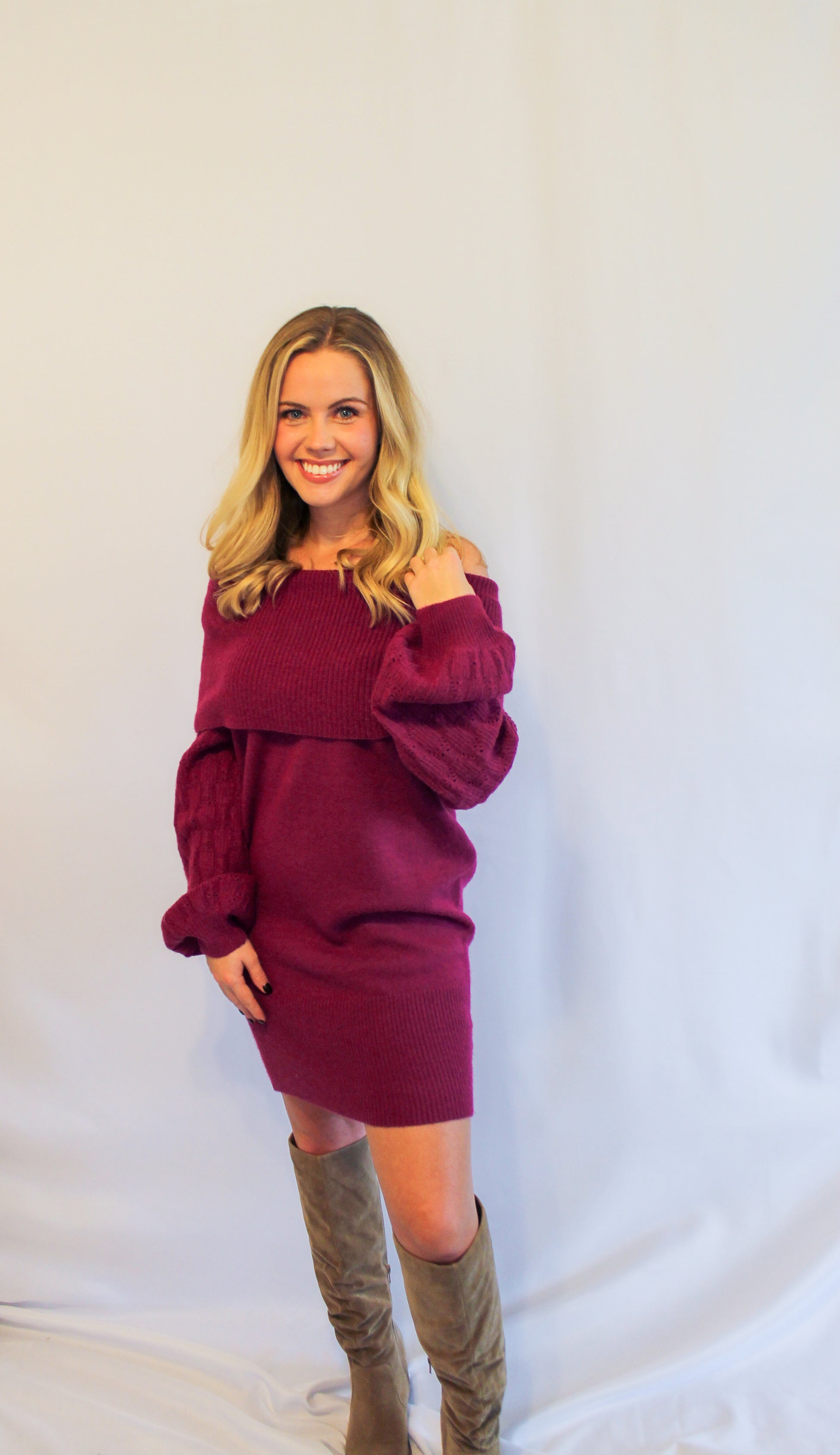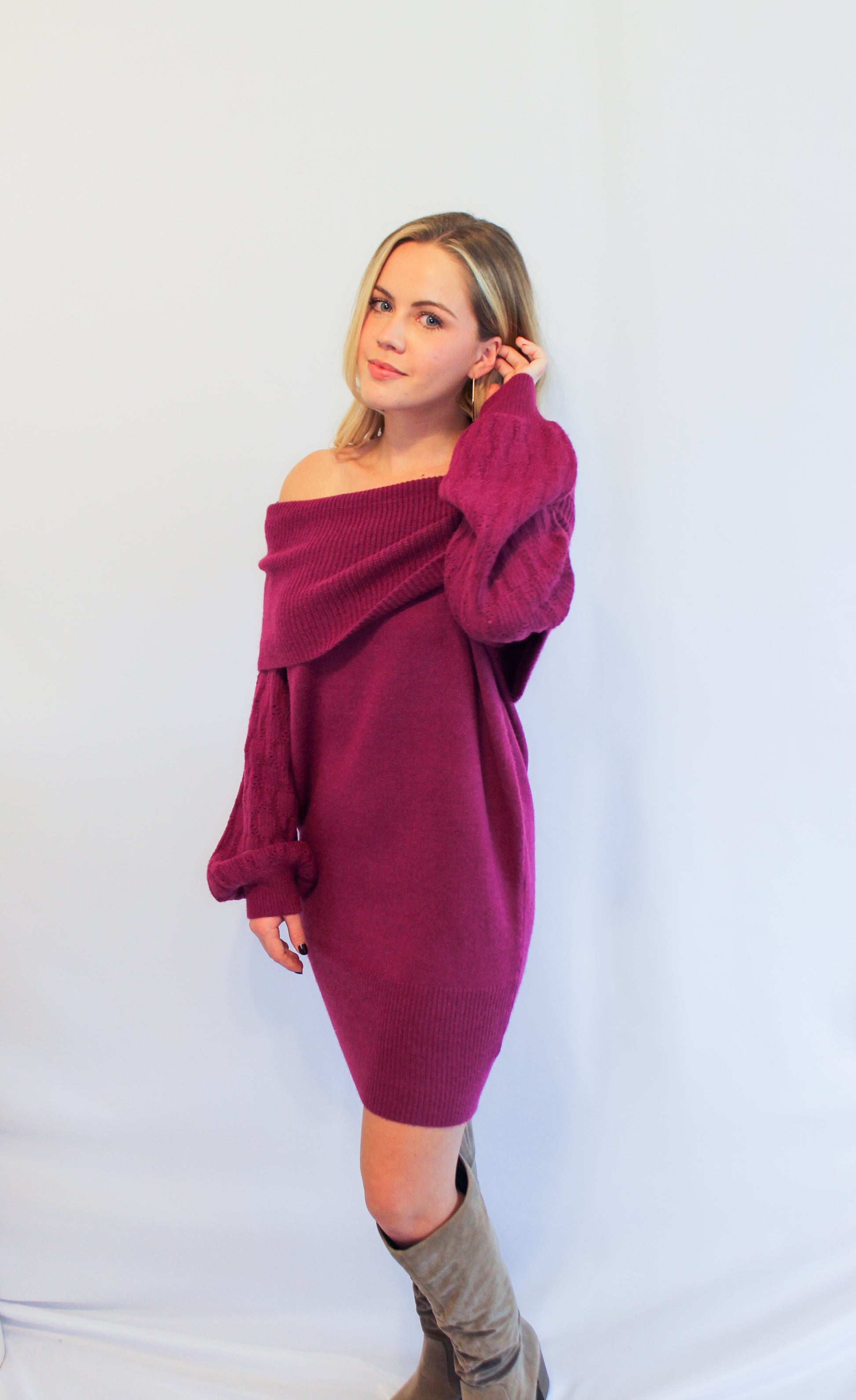 Make a statement in this magenta sweater dress. This dress is extremely cozy. It features a rolled off the shoulder neckline with puff sleeves made in a ribbed knit fabric.