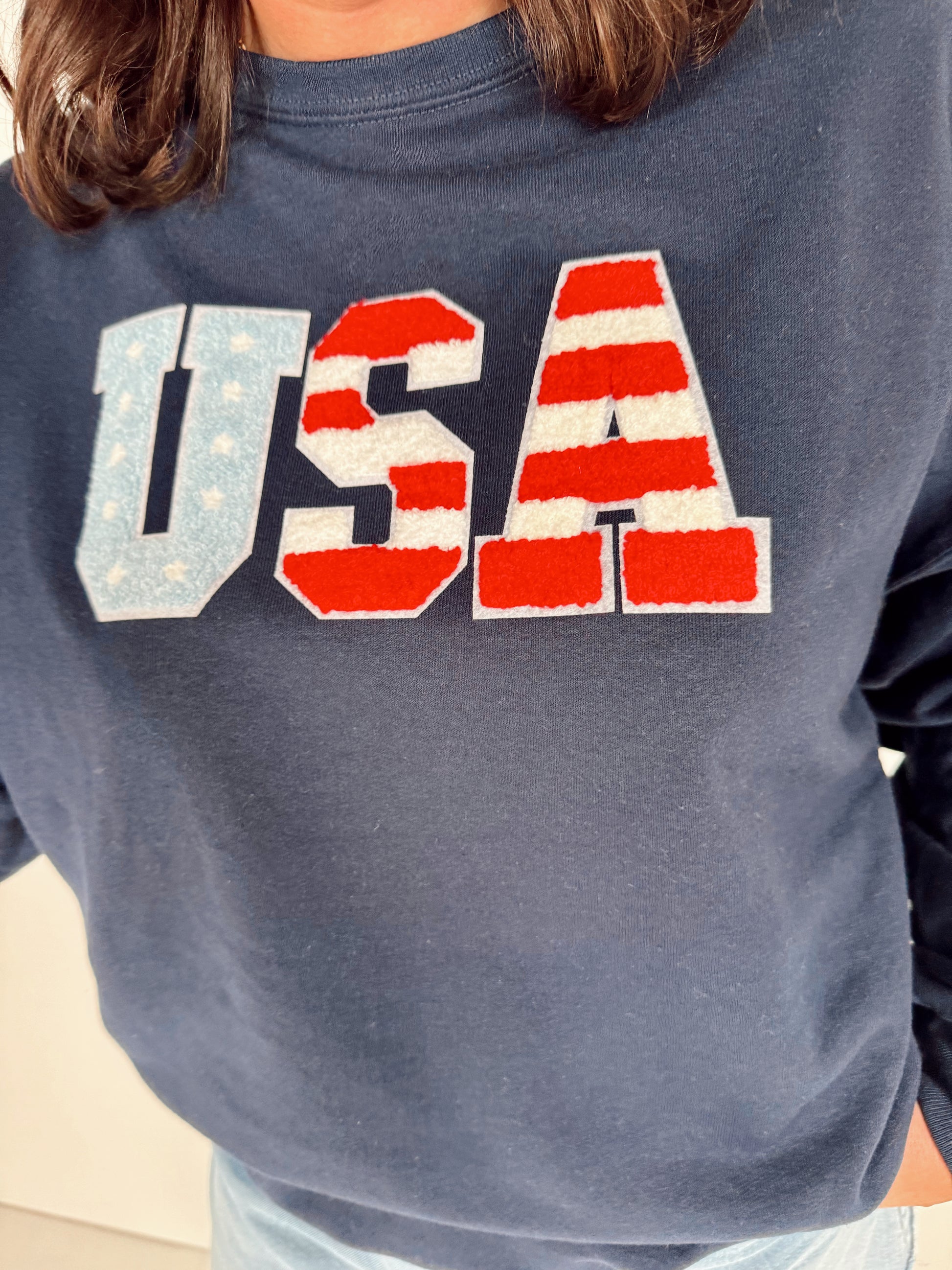 This cozy and unique chenille USA Flag Crewneck Sweatshirt makes the perfect 4th of July outfit! This makes a perfect patriotic sweatshirt all year round!